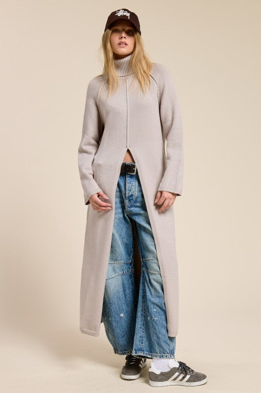 Make a bold winter fashion statement with this unique turtleneck tunic sweater dress. It showcases a high ribbed contrast turtleneck, seam detailing on shoulders and center, complete with an open front slit and midi-length fit.