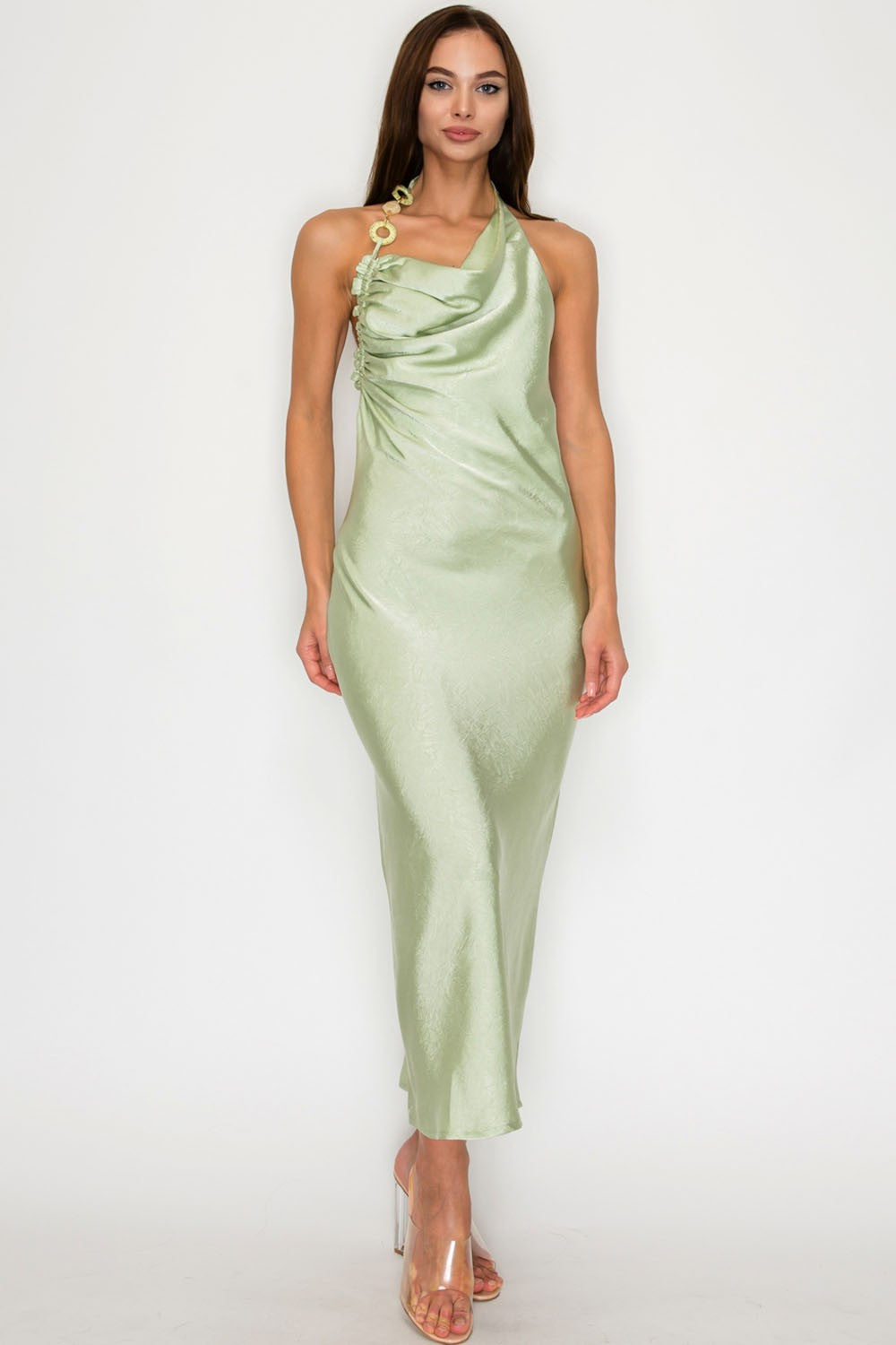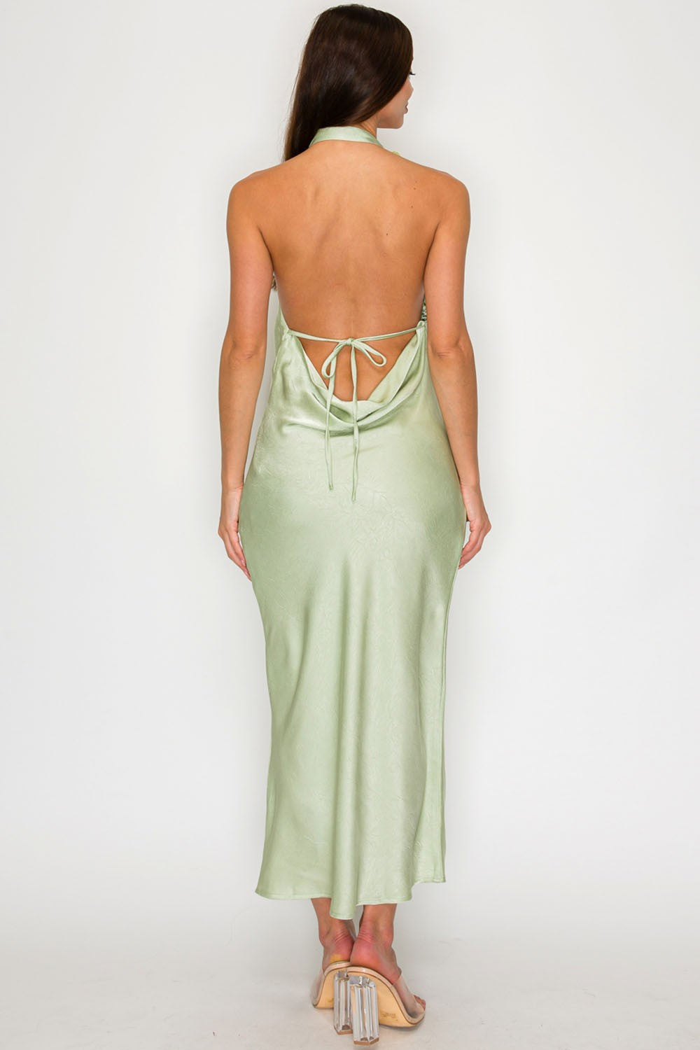 Step out in style with this chic one shoulder backless satin dress. The light green hue adds a fresh touch to your wardrobe, perfect for any occasion.