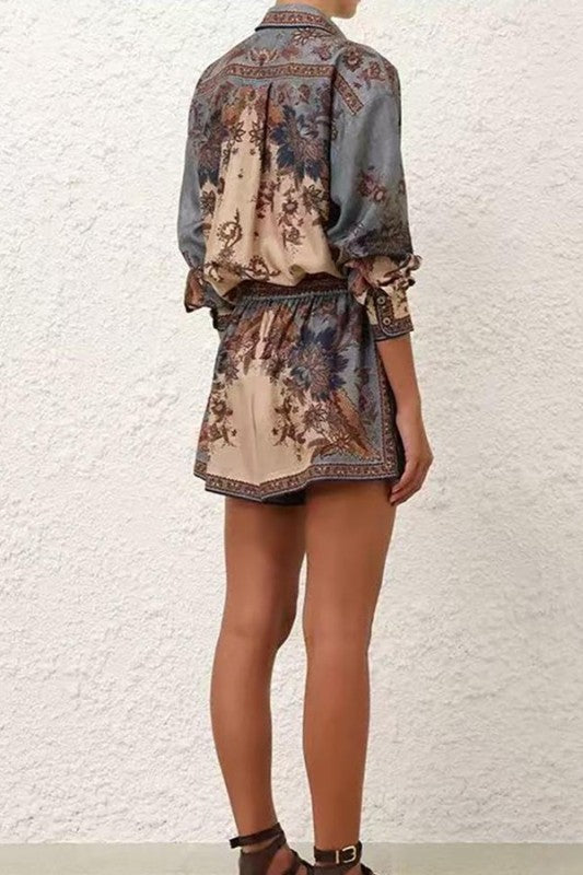 Be an on-trend babe in this two piece printed set! Our Edalene Set features button down shirt with long sleeves and matching elastic shorts.