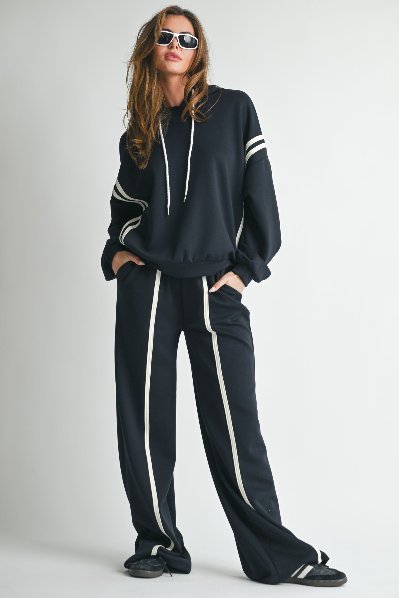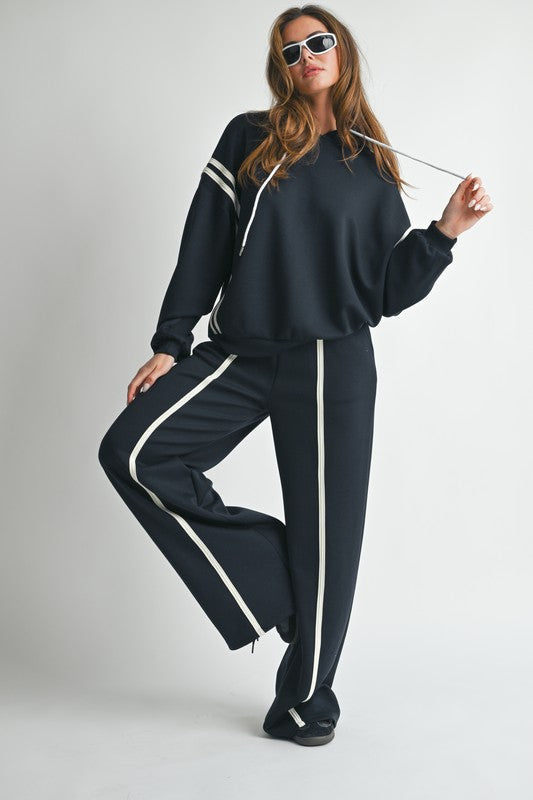 Trendy babes will love the Enzo two-piece set in black with white stripes. The pants are straight leg and the top has a hoodie. Style the pieces together or maximize as separates.