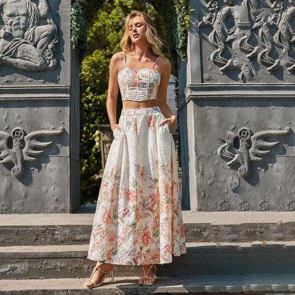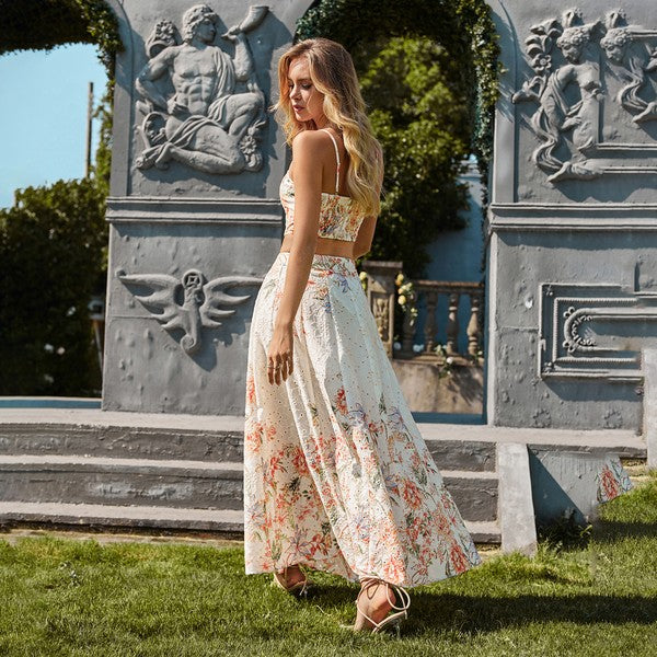 This floral eyelet two-piece set brings a touch of romance to warm-weather styling. Featuring a spaghetti strap crop top and a flowing high-waisted maxi skirt, both adorned with delicate floral embroidery, this set offers a breezy yet sophisticated look. Wear it together for a statement outfit or mix and match for endless styling possibilities.