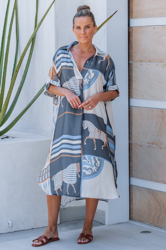 Chic and trendy, the Sorrento Shirt Dress in horse print features a collar, short sleeves and pockets.